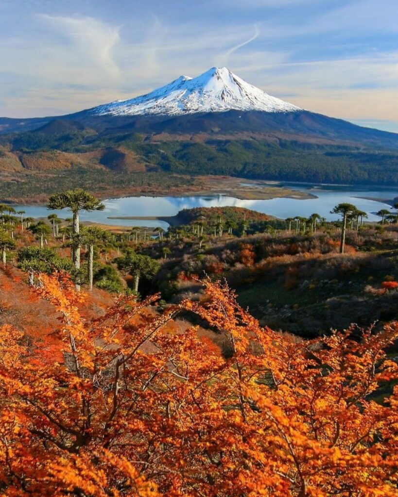 La Región de La Araucanía regala una de las postales más icónicas de la temporada en el Parque Nacional Conguillío. Con sus araucarias milenarias, bosques nativos tejidos de verdes, dorados y rojizos, y el volcán Llaima de fondo, encontrarás un paisaje espectacular que se robará todos los likes.