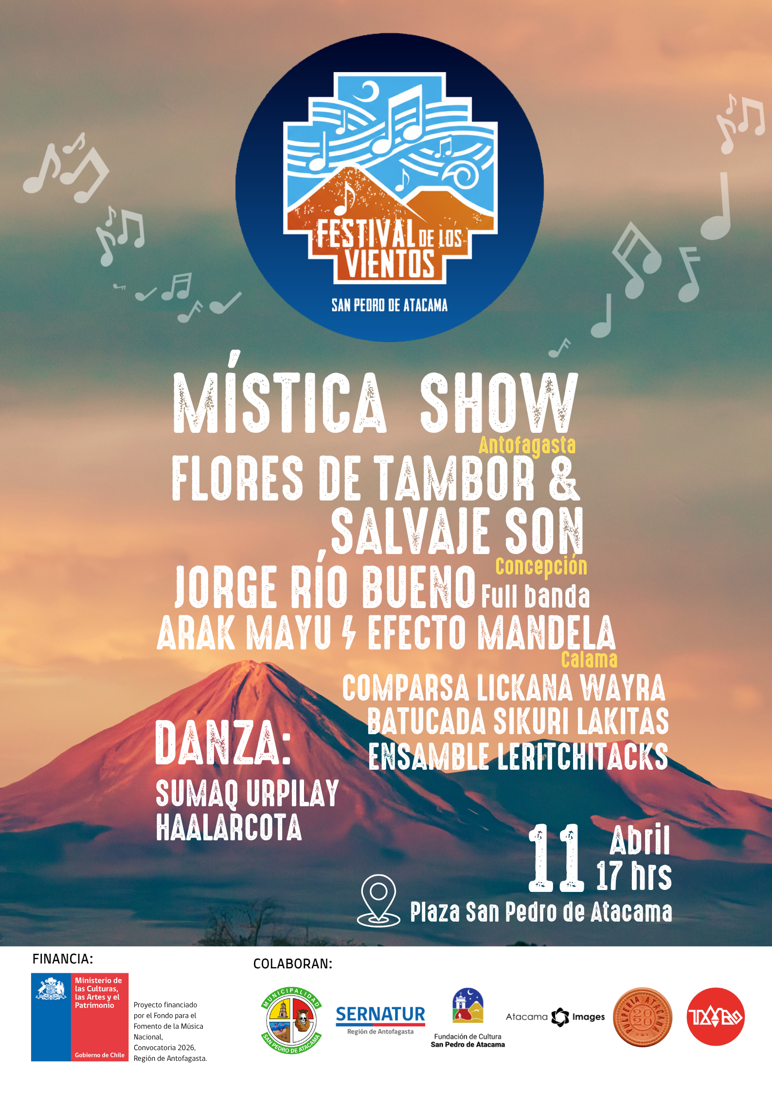 Con los instrumentos de viento como eje, el evento reunirá músicos de San Pedro de Atacama, Calama, Antofagasta y Concepción, generando un diálogo entre tradiciones andinas, música popular latinoamericana y otras expresiones. Entre los artistas más destacados están Salvaje Son (Concepción) y Flores de Tambor (local), quienes se presentarán en la plaza principal con un repertorio de folklore afrocolombiano.