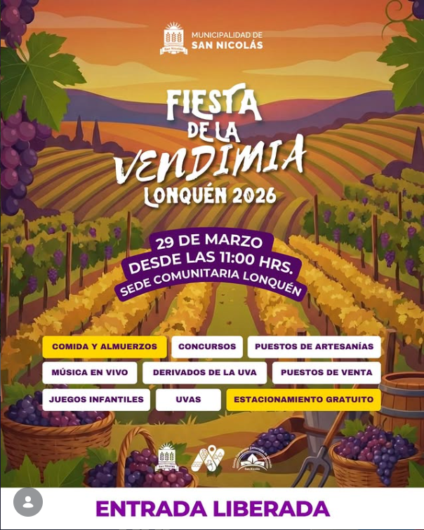 La comuna de San Nicolás se prepara para recibir a locales y turistas en una nueva edición de la Fiesta de la Vendimia Lonquén 2026. Este encuentro tradicional se llevará a cabo el próximo domingo 29 de marzo, a partir de las 11:00 horas, en la Sede Comunitaria de Lonquén.