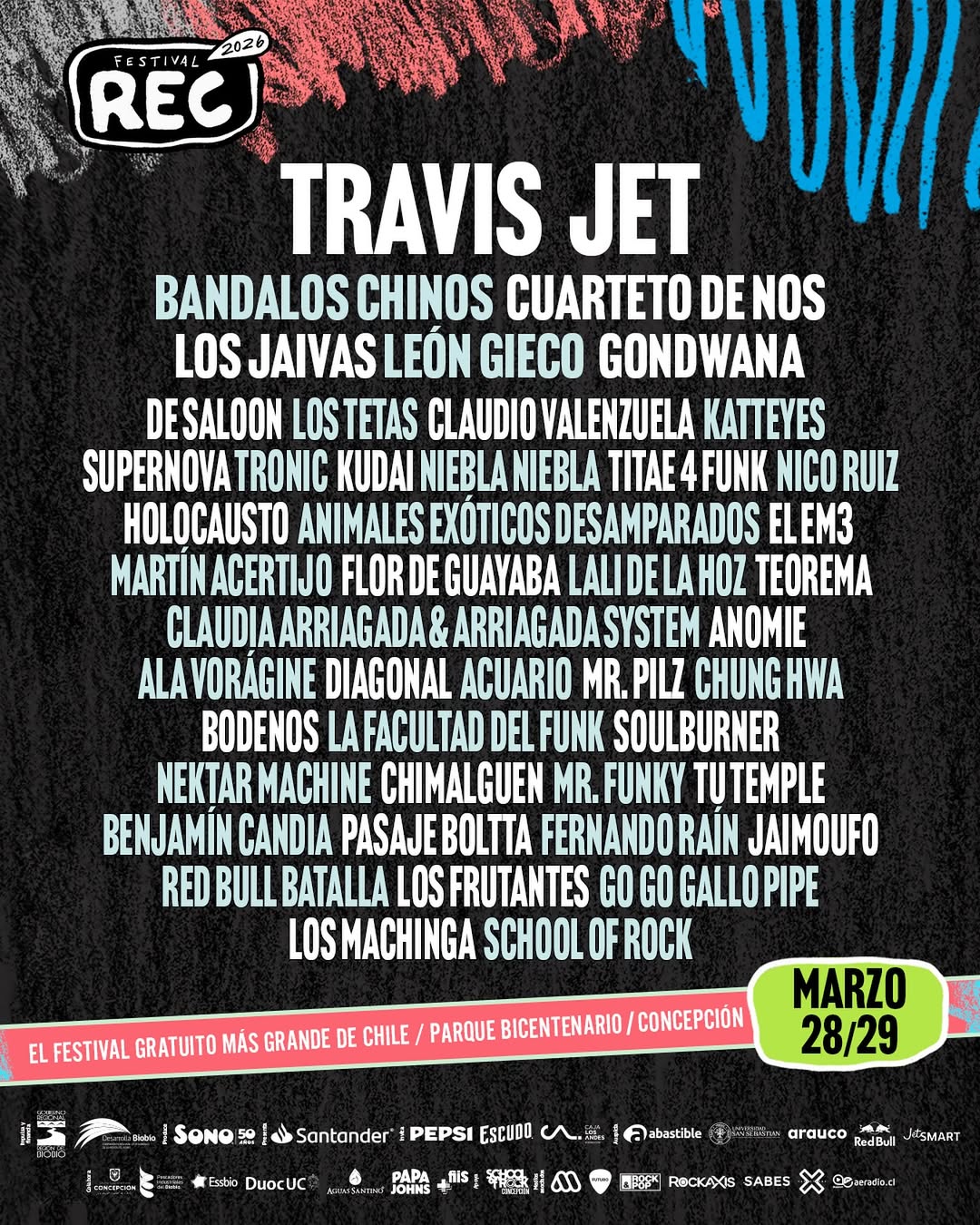 Rock en Conce (REC) 2026 ya tiene line up. Este 28 y 29 de marzo, el festival gratuito más grande de Chile desarrollará una nueva edición en el Parque Bicentenario de Concepción.