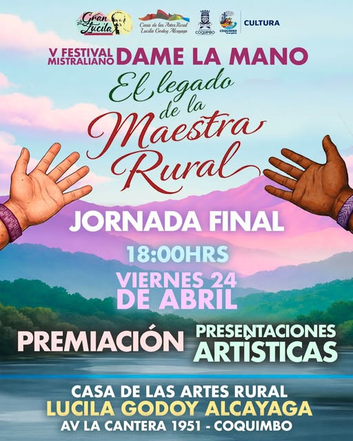 ¡Vive el gran cierre del V Festival Mistraliano «Dame la Mano» en la Región de Coquimbo! Tras dos meses recorriendo diversos territorios de la región e inspirando a niñas y niños con el legado de nuestra gran Gabriela Mistral, este 24 de abril a las 18:00 horas llega el momento de culminar esta quinta edición con broche de oro.
