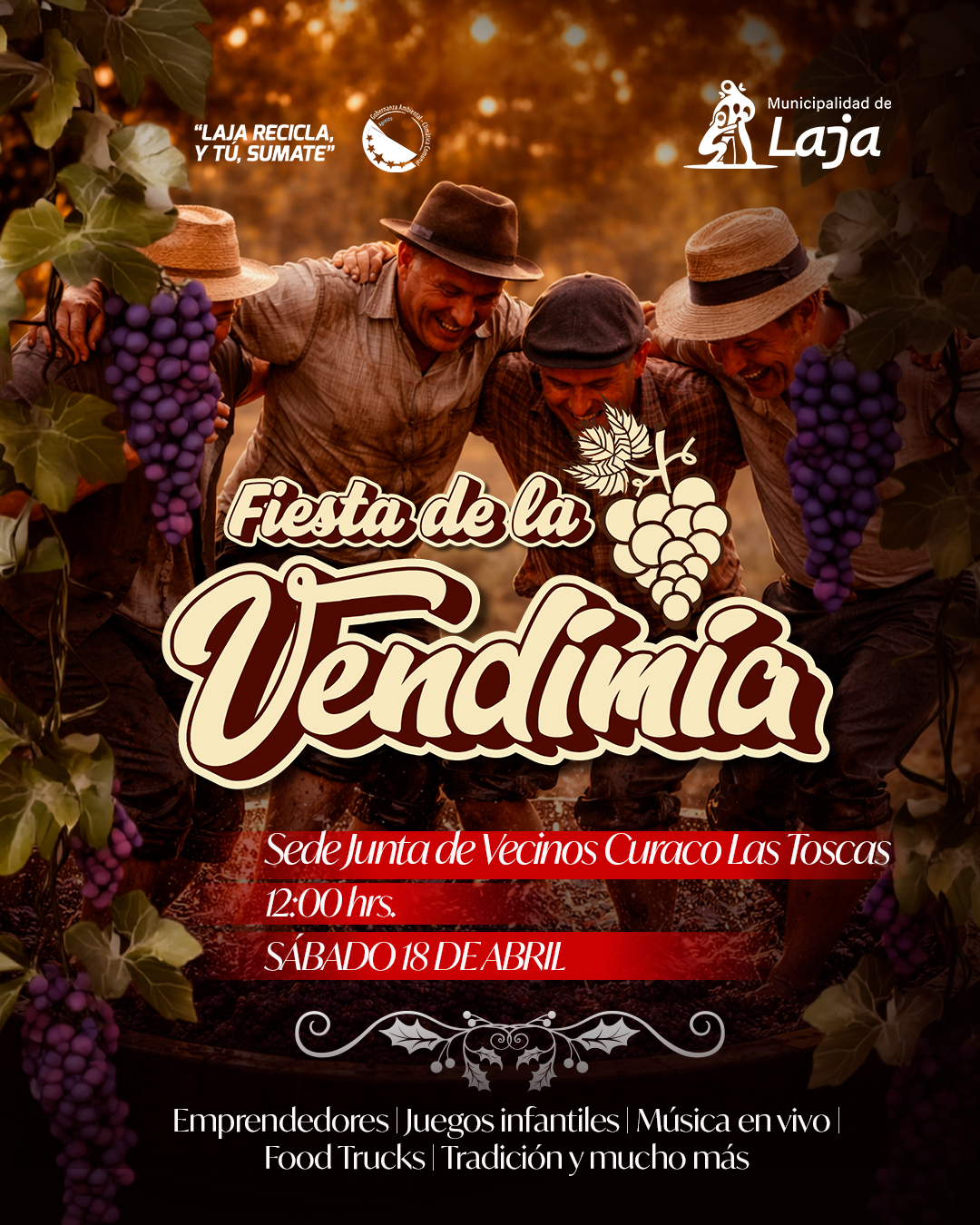 La comuna de Laja invita a vivir una nueva edición de su Fiesta de la Vendimia. Este sábado 18 de abril, la sede de la Junta de Vecinos de Curaco Las Toscas será el punto de encuentro para celebrar las tradiciones del campo.