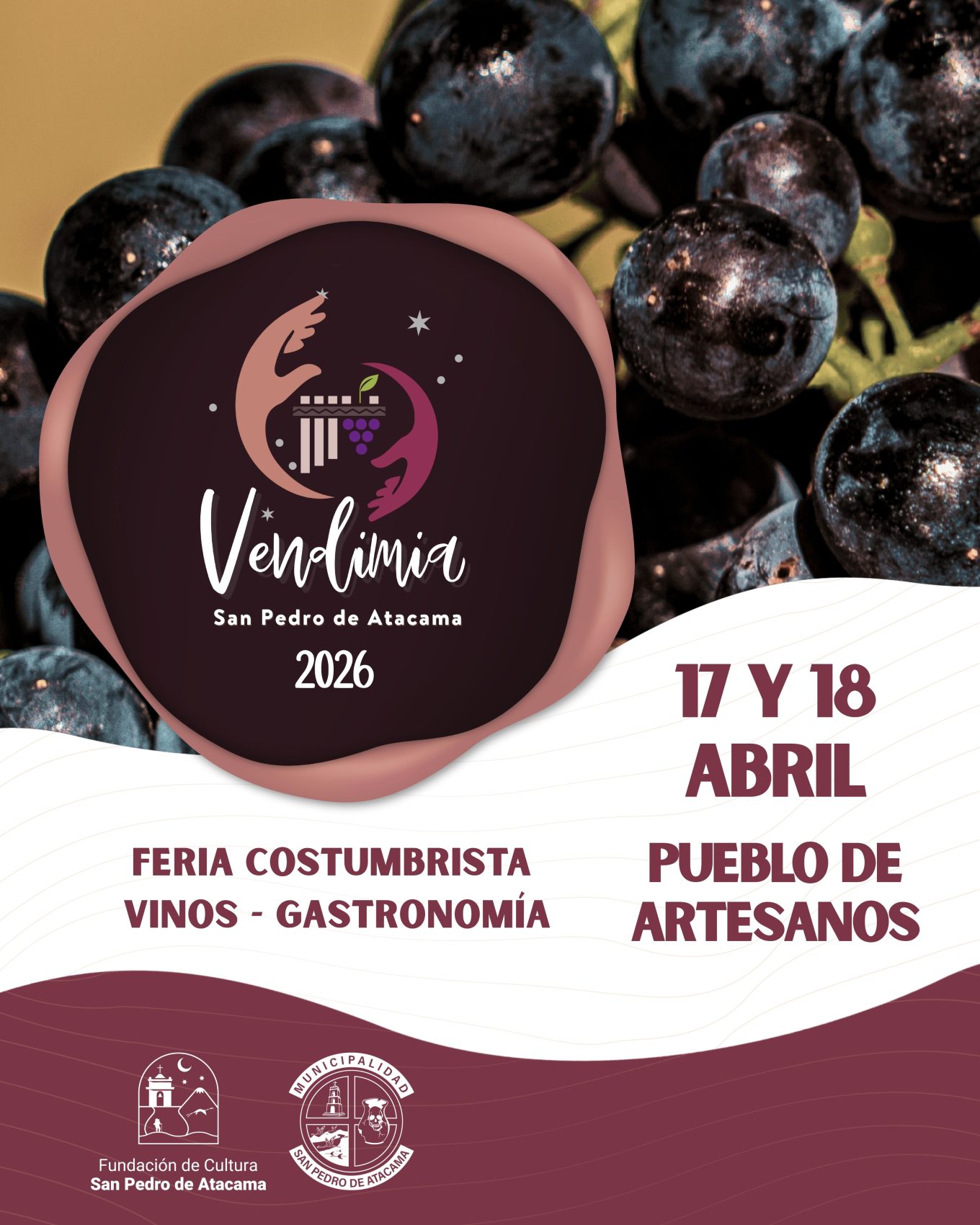 ¡Descubre el milagro del vino en el desierto! Los días 17 y 18 de abril de 2026, San Pedro de Atacama te invita a celebrar su Fiesta Costumbrista de la Vendimia en el Pueblo de Artesanos.