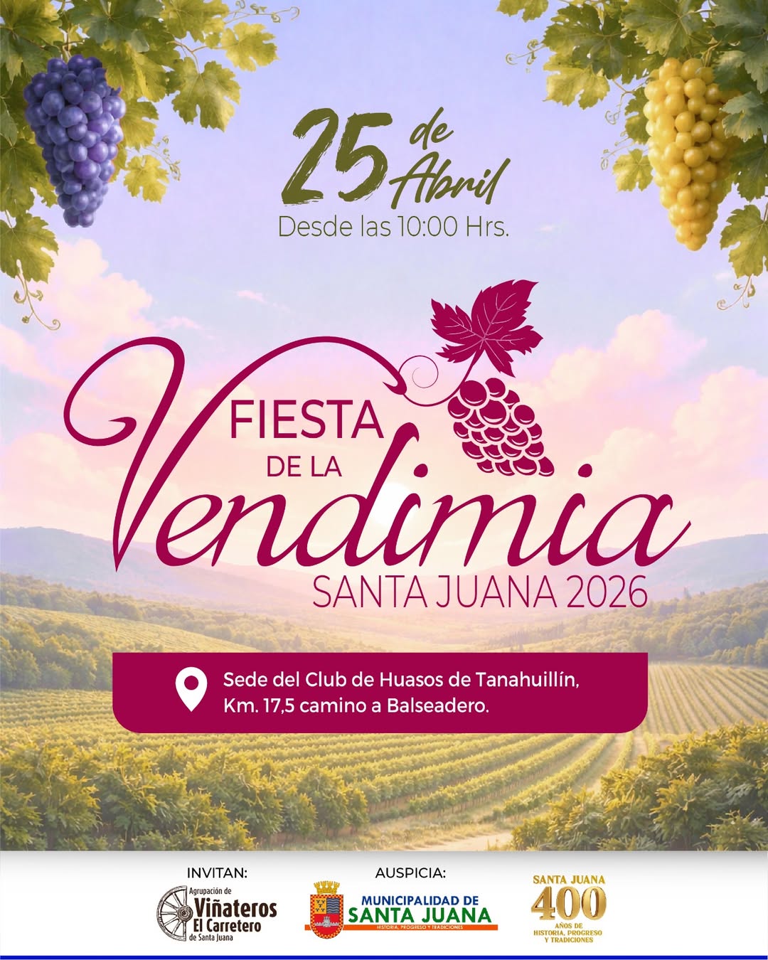 La comuna de Santa Juana celebra 400 años de historia con una nueva edición de su Fiesta de la Vendimia. El municipio invita a la comunidad a vivir una jornada de tradiciones y folclore este sábado 25 de abril, desde las 10:00 horas.