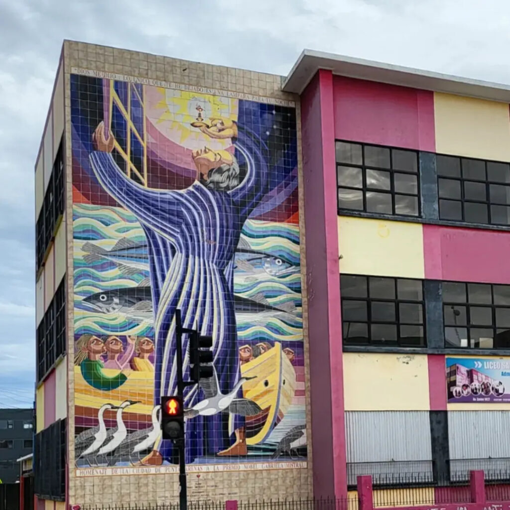 En la intersección de avenida Cristóbal Colón con Jorge Montt, a pasos del centro de Punta Arenas, un colorido mural rinde homenaje al paso de Mistral por la Región de Magallanes.
